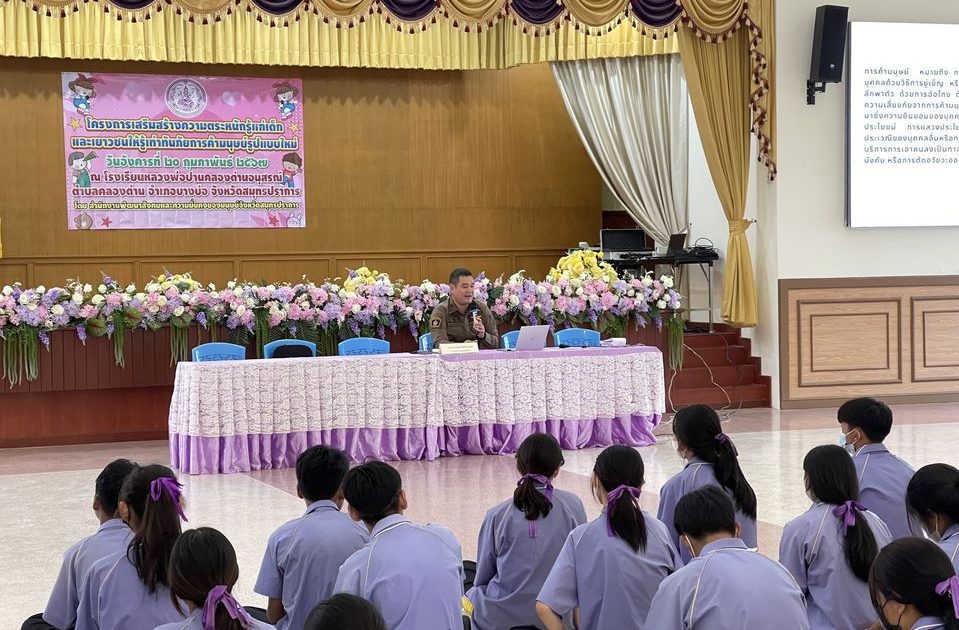 พ.ต.ท.การุณย์ ลิมปิโรจนฤทธิ์ รอง ผกก.ป.สภ.คลองด่าน ร.ต.อ.ชวลิต ทองเพียร รอง สว.(ป.)สภ.คลองด่าน พร้อมข้าราชการตำรวจ สภ.คลองด่าน ร่วมเป็นวิทยากร “โครงการเสริมสร้างความตระหนักรู้แก่เด็กและเยาวชนให้รู้เท่าทันภัยการค้ามนุษย์รูปแบบใหม่” โดยมีวัตถุประสงค์เพื่อเสริมสร้างความตระหนักรู้ถึงภัยจากการค้ามนุษย์แก่เด็กและเยาวชน ครู ให้รู้เท่าทันสถานการณ์รูปแบบการค้ามนุษย์รูปแบบใหม่ ที่เกิดจากสื่อสังคมออนไลน์ ณ โรงเรียนหลวงพ่อปานคลองด่านอนุสรณ์ ต.คลองด่าน อ.บางบ่อ จว.สมุทรปราการ