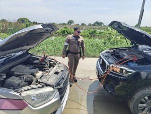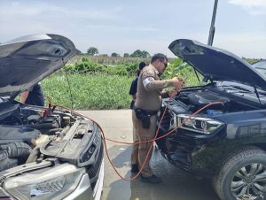เจ้าหน้าที่ตำรวจจราจร สภ.คลองด่าน ให้การช่วยเหลือประชาชน กรณีขอความช่วยเหลือรถแบตเตอรี่หมด บริเวณสะพานเผด็จ บางเพรียง รถกลับมาใช้ได้ปกติ